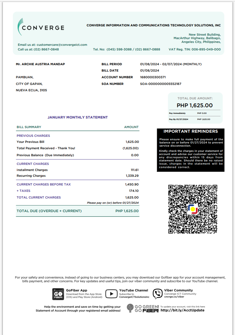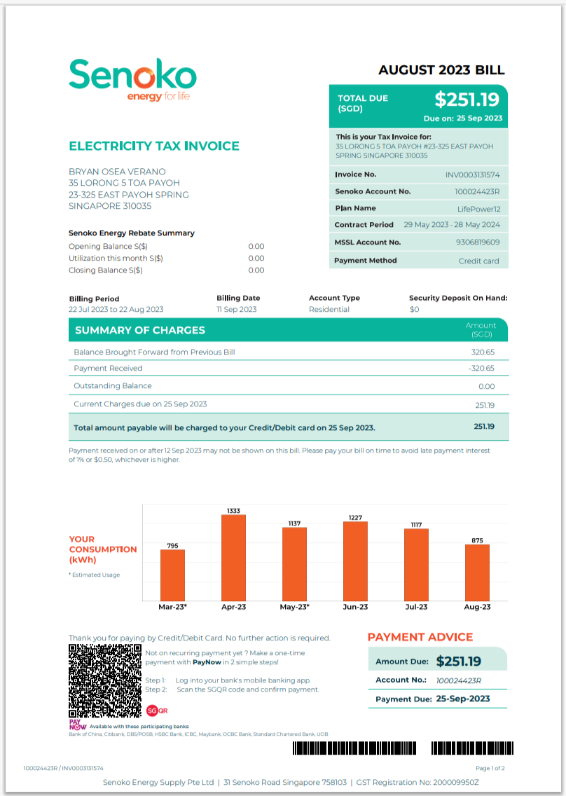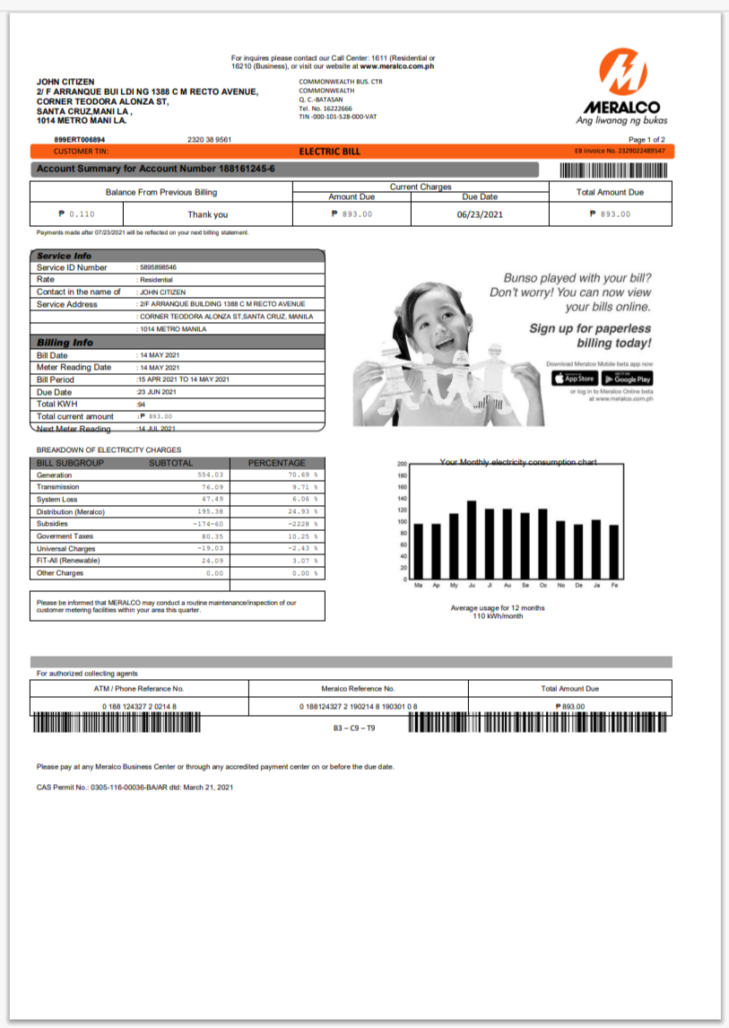 Philippines Manila Electric Company Meralco Electricity Utility Bill Word And PDF