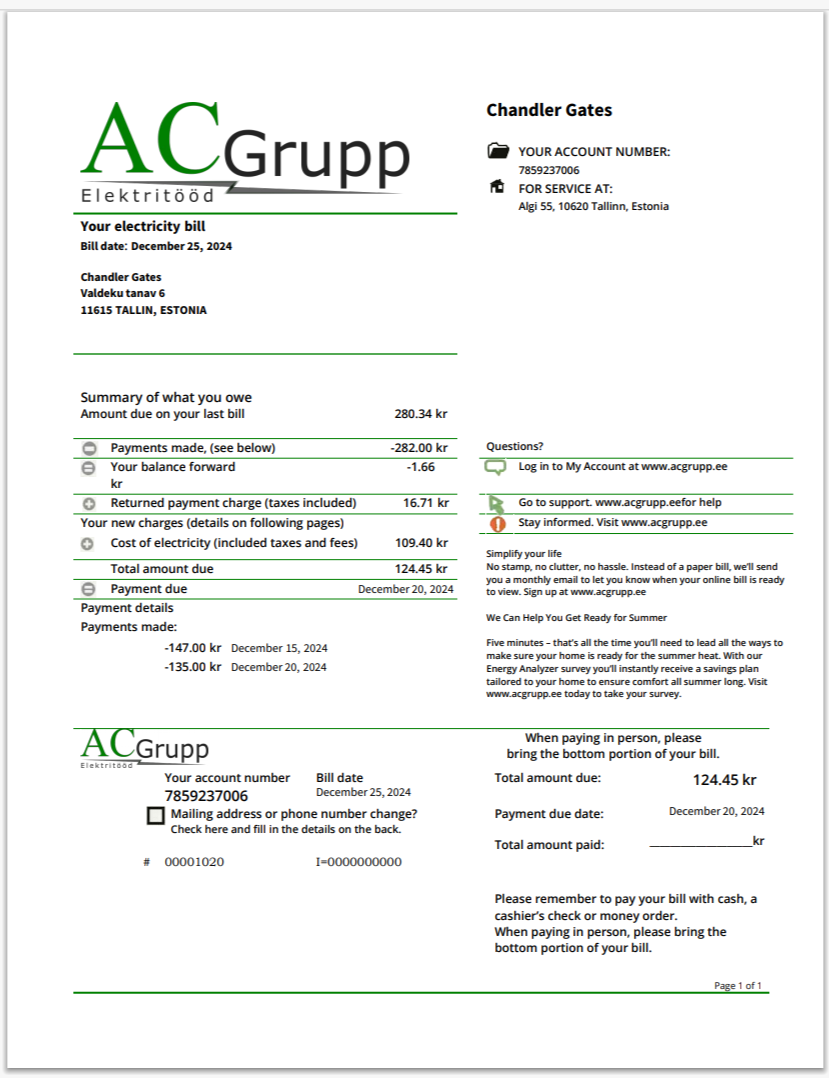 Norway BKK Electricity Utility Bill Word And PDF